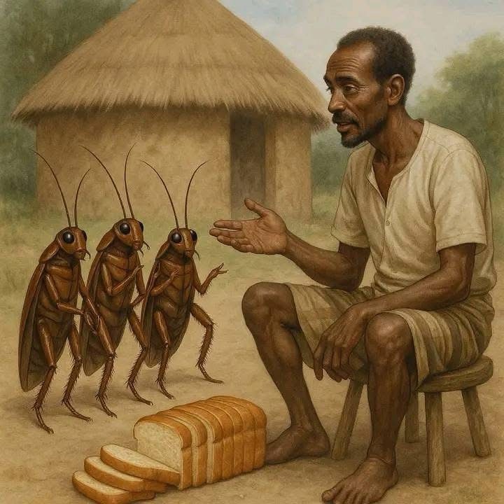 Three hungry cockroaches came to a farmer and asked him for food. He willingly offered them some bread and some cheese. They ate to satisfaction and saved food to take home to their families.