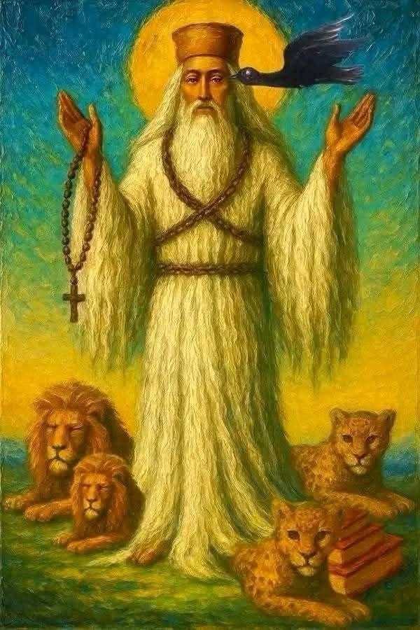 For a time Gebre remained in the desert performing miracles, while people from remote countries visited him. Then a second time God sent Gabriel to take Gebre deeper into the desert, and to have him live amongst 60 lions and 60 leopards. While there, Abune Gebre Menfes Qidus developed thick white hair covering all his body like a coat. He was able to appease the wild beasts, and in this respect resembled the figure of Daniel from the Old Testaments, as he was able to talk to the animals.
