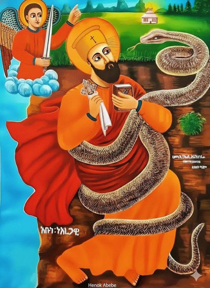 This holy man became a guide to the servants of God on the road. He went up to the holy Dabra Damo holding the tail of a serpent, and there he fought countless noble fights. God graciously made a covenant with him concerning the man who should call upon his name, and the man who should celebrate his commemoration, and then he was hidden from the face of death by the grace of God. He established among his children the Rules for the Monastic Life, which he had learned in the house of his father Pachomius.